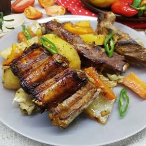Само блюдо: ребрышки не разрезая натереть маринадом с двух сторон, положить в емкость и накрыть крышкой и поставить на 2 часа в холодильник. Картофель порезать ломтиками толщиной 7-8 мм, посолить, полить раст. маслом, перемешать и выложить на застеленный фольгой противень или форму для запекания. На картофель положить промариновавшиеся ребрышки изгибом вверх. Запечатать форму фольгой и поставить в духовку, предварительно разогретую до 180 градусов, на 40 минут. Смешать мед с горчицей, вынуть форму, осторожно отогнуть край фольги и помазать ребрышки сверху. Вернуть их в духовку еще на 10 минут. Подавать горячими, разрезав, со сметаной, свежей зеленью, помидорами и под сухое красное вино.